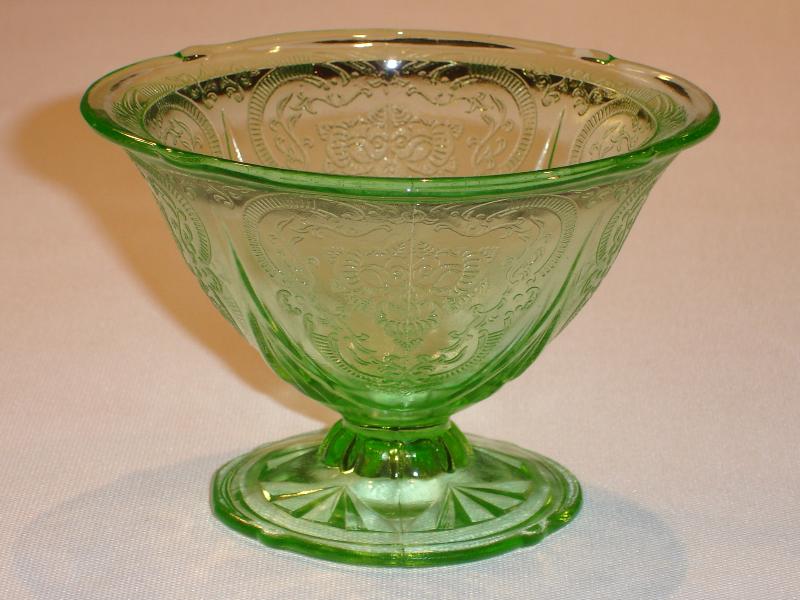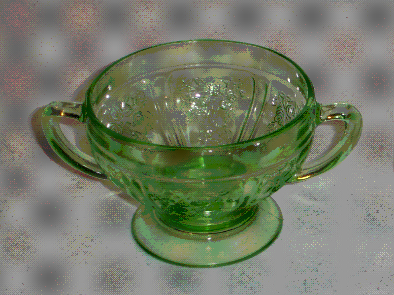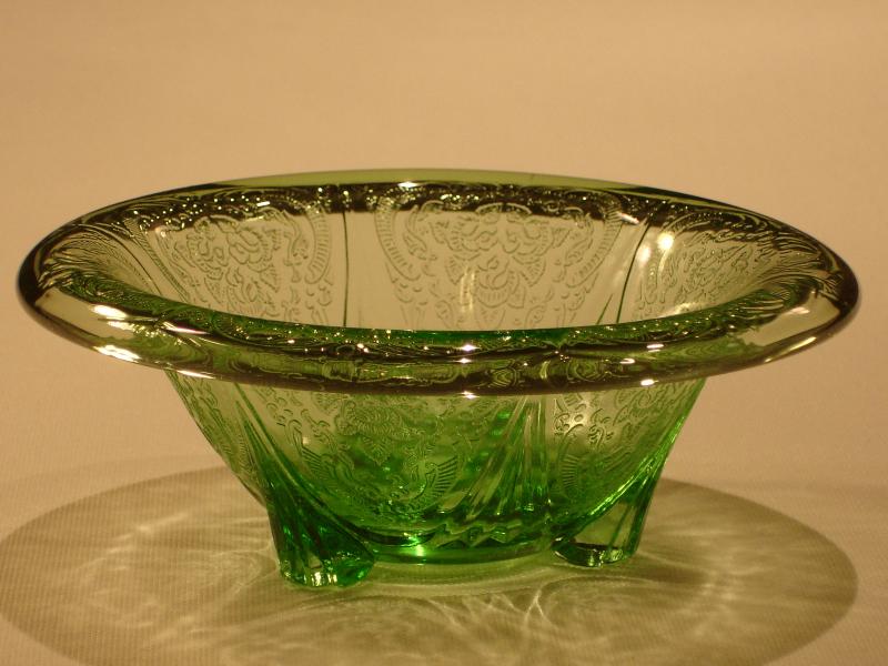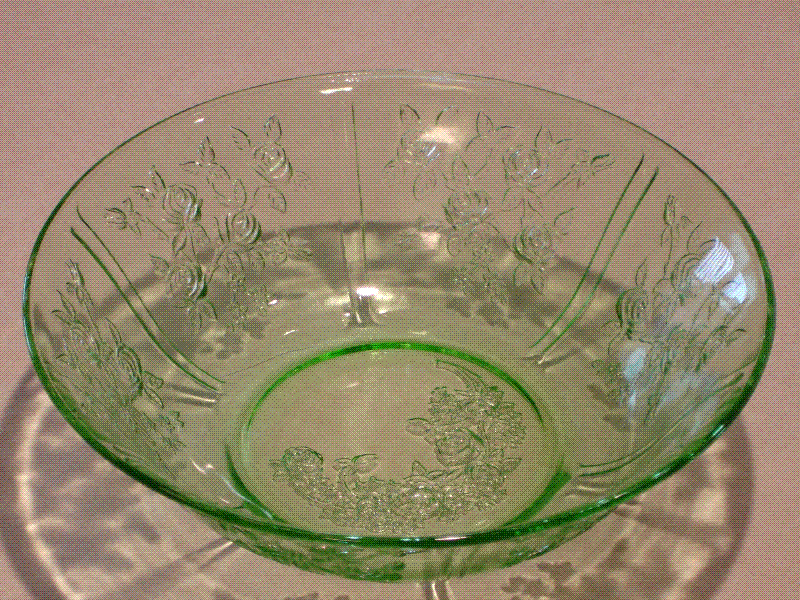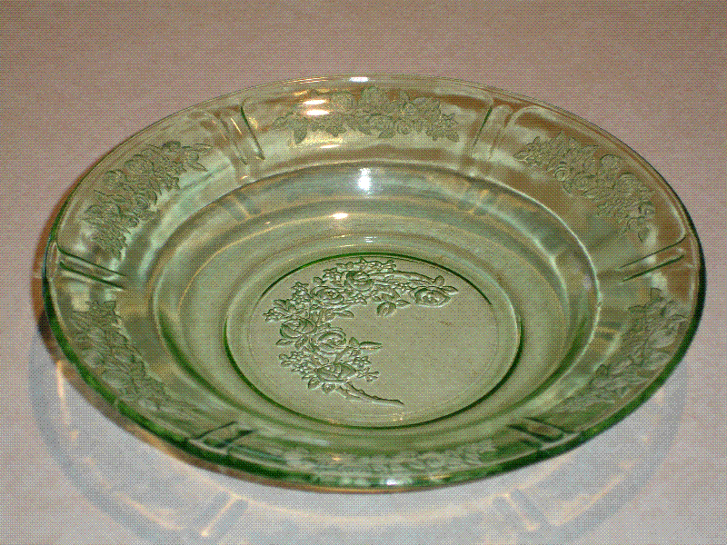 Green depression glass was the second most popular color made of the top one hundred and fifty depression glass patterns.  About one hundred and ten depression glass patterns were made in green glass.  The Rose Cameo pattern is the only one that was made exclusively in green.  Otherwise, if a depression glass pattern had green colored glass, it was also made in crystal or pink or yellow glass.