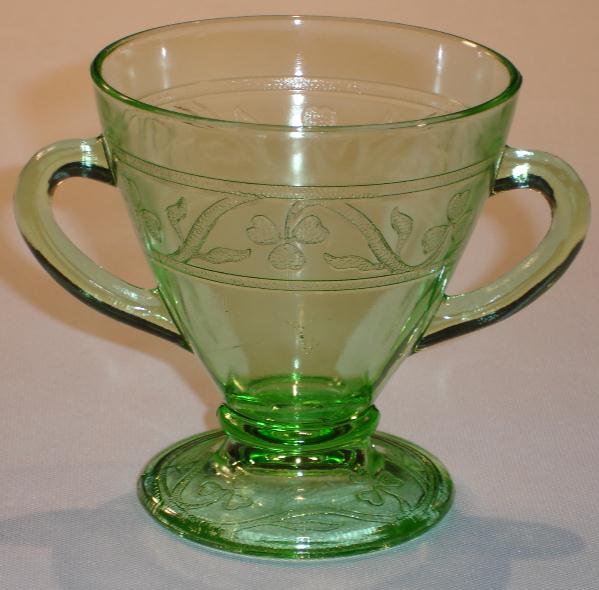 Only one type of sugar was made in the Cloverleaf pattern. It is footed, and doesn’t have a lid. The Cloverleaf pattern is in a band centered between the double handles. The creamer stands three and one-half inches tall and has an opening diameter of three and one-quarter inches. It was made in the colors green, yellow, and black.