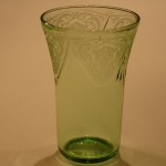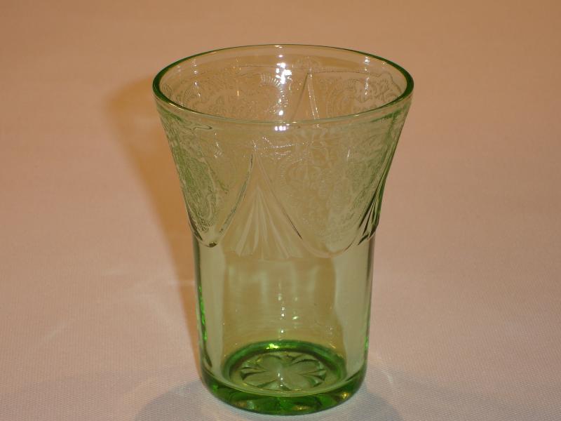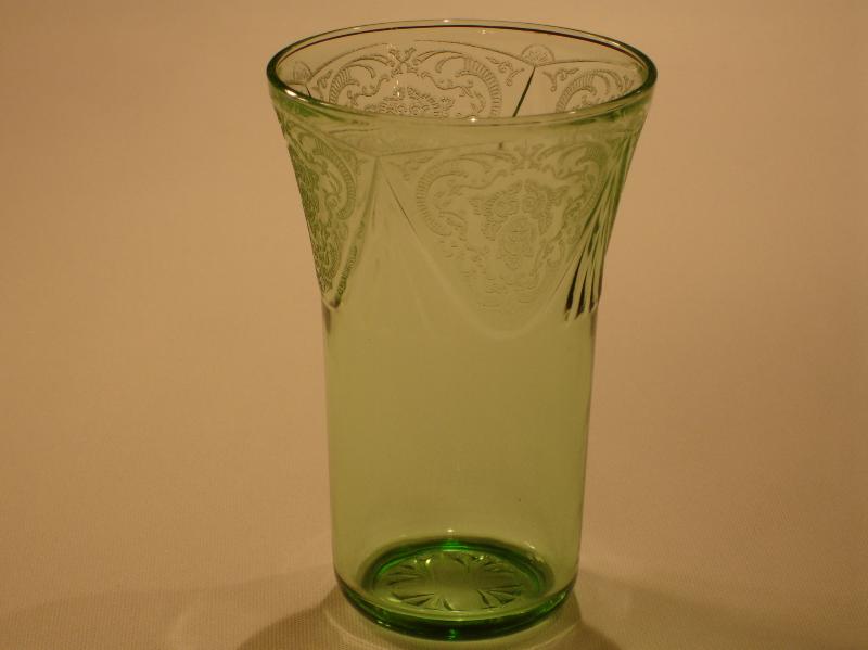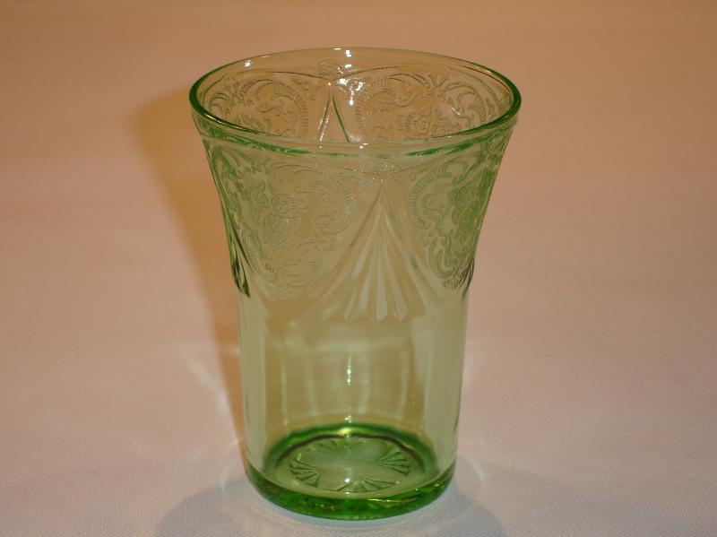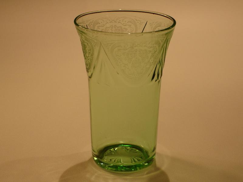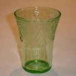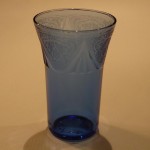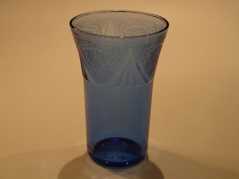 Four different sized tumblers were made in the Royal Lace pattern. They were made in the colors cobalt blue, green, pink, and crystal. The 5 ounce tumbler is three and one-half inches tall with a diameter of two and five-eighths inches. The 9 ounce tumbler is four and one-eighth inches tall and three and one-quarter inches in diameter. The 10 ounce tumbler is four and seven-eighths inches tall and three and one-eighths inches in diameter. The 12 ounce tumbler is five and three-eighths inches tall and three and three-eighths inches in diameter.