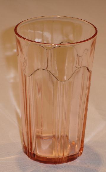 Nine different tumblers were made in the Colonial Knife and Fork pattern. Two different types of tumblers, flat and footed, were made. All were made in the colors pink, green, and crystal.