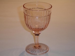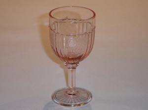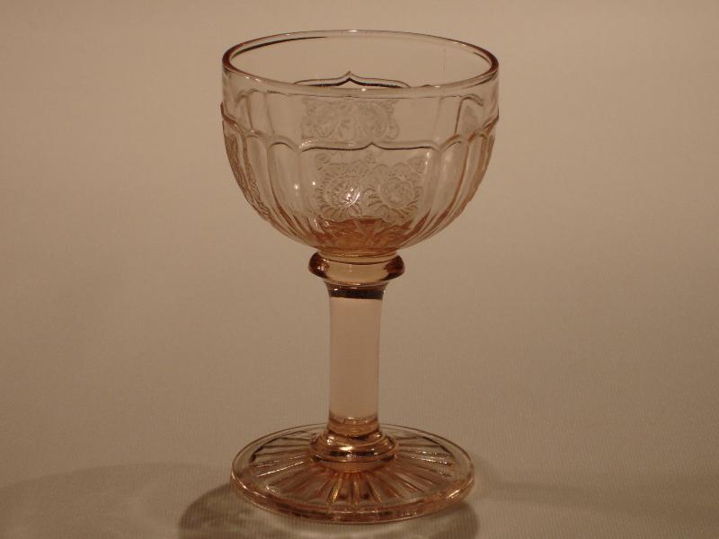 Seven different goblets were made in the Mayfair Open Rose pattern. The one ounce, three and three-fourths inches tall, cordial goblet was made in the colors of pink and green. This goblet is the most rare. The two and one-half ounce, four and one-eighths inches tall goblet was made in the colors pink and green. The three ounce cocktail goblet was made in the colors pink and green, and is four inches tall by two and three-eighths inches in diameter. The three ounce wine goblet was made in the colors pink and green, and is four and one-half inches tall and two inches in diameter. The four and one-half ounce, five and one-quarter inches tall claret goblet was made in the colors pink and green. The nine ounce water goblet was made in the colors pink and green, and is five and seven-eighths inches tall by three and one-quarter inches in diameter. The nine ounce, seven and one-quarter inches tall goblet was made in the colors of pink and blue.