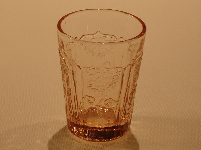 The Mayfair Open Rose whiskey tumbler was only made in the color pink. It holds one and one-half ounces and stands two and one-quarter inches high with a diameter of one and five-eighths inches. This piece has been reproduced. The easiest way to determine if the whiskey is an original or a reproduction is to look at the bottom of the flower stem. The original stem branches or splits into two at the bottom. The reproduction has a single stem.