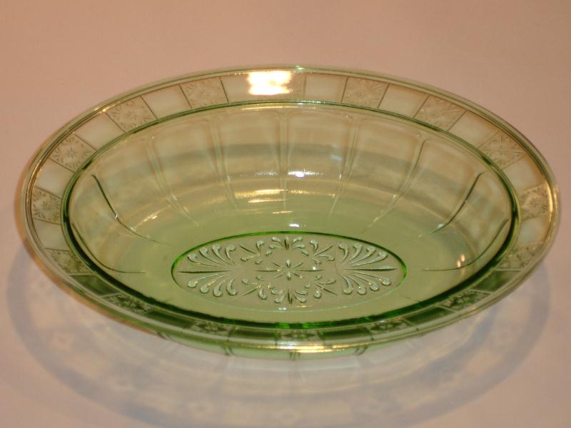 Six different bowls were made in the Doric pattern. The four and one-half inch diameter berry bowl stands one and three-quarter inches high. The eight and one-quarter inch diameter large berry bowl stands three inches high. Both the large and small berry bowls were made in the colors pink, green, and delphite. The five inch in diameter, two handled cream soup bowl is the rarest bowl in the Doric pattern. It was only made in the color green. The five and one-half inch diameter cereal bowl stands two inches high. The two handled bowl is nine inches in diameter, and oval vegetable bowl is nine and one-half inches by seven and one-quarter inches. Both the two handled bowl and the oval vegetable bowl were made in the colors pink, and green.