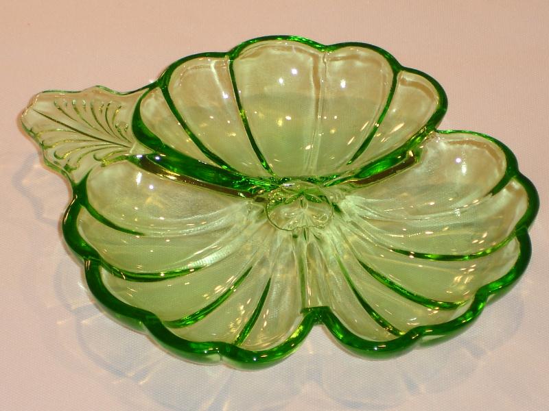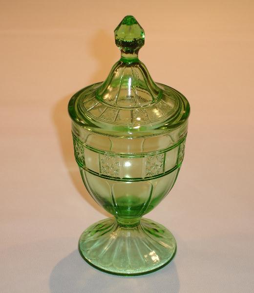 Two different candy dishes were made in the Doric pattern. The covered candy dish stands eight and one-eighth inches high and has a diameter of three and one-half inches. It was made in the colors pink and green. The three part candy dish is flat, and looks like a clover leaf. It’s dimensions are seven by six and one-quarter inches. It was made in the colors pink, green, delphite, ultra-marine, and iridescent. A separate metal holder was made for this dish, and having it with the dish increases the value considerably.