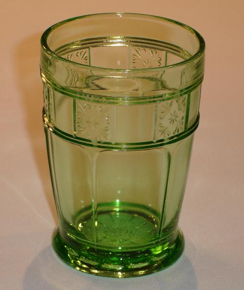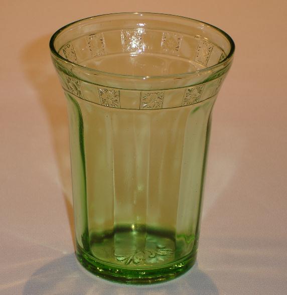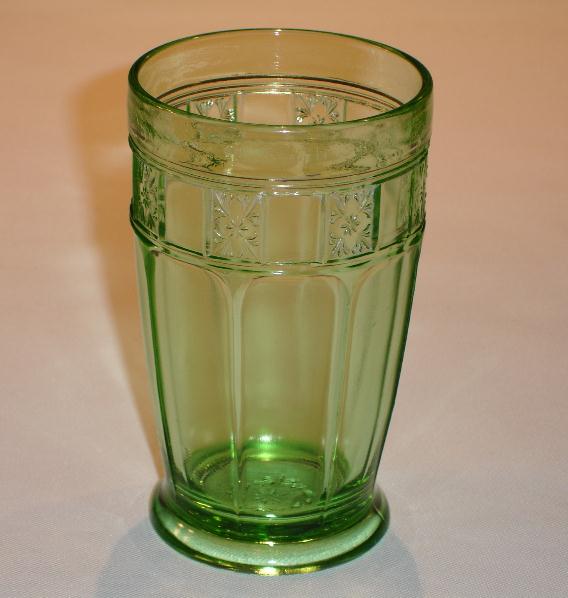 Three different tumblers were made in the Doric pattern. The nine ounce tumbler was made of a thin glass, and only a small ring of the Doric pattern at the top. It stands four and one-eighth inches tall, and has an opening diameter of three and one-eighth inches. The two other tumblers, a ten ounce and a twelve ounce, were made out of a thicker glass, and are both footed with a larger Doric pattern at the top. The ten ounce tumbler is four and one-eighth inches tall with an opening diameter of two and seven-eighths inches, and the twelve ounce tumbler is five and one-eighth inches tall with an opening diameter of three inches. All three tumbler were made in the colors pink and green. The green twelve ounce tumbler is the rarest.